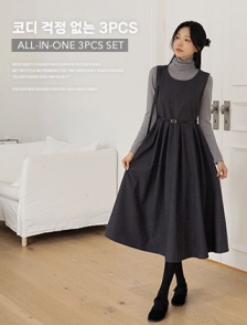 폴라넥 니트+플리츠 원피스+벨트 3PCS 세트