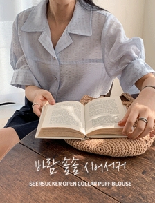 오픈카라넥 퍼프소매 시어서커블라우스